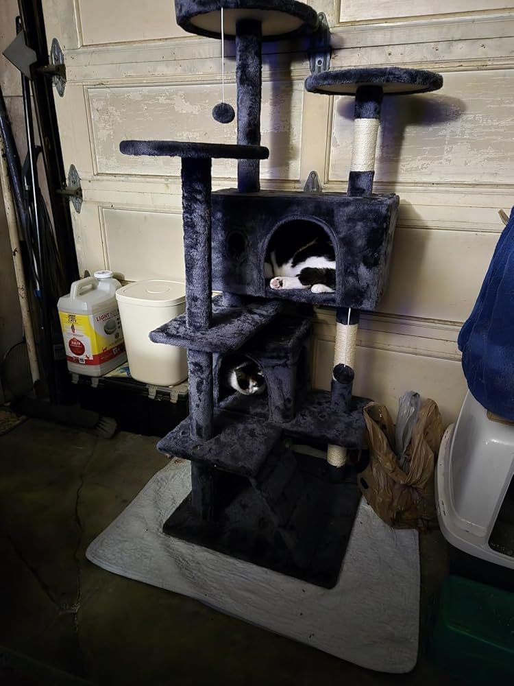 The Cat Tree is constructed from high-quality particle board and features a plush faux-fur cover for comfort, along with sisal-covered scratching posts.